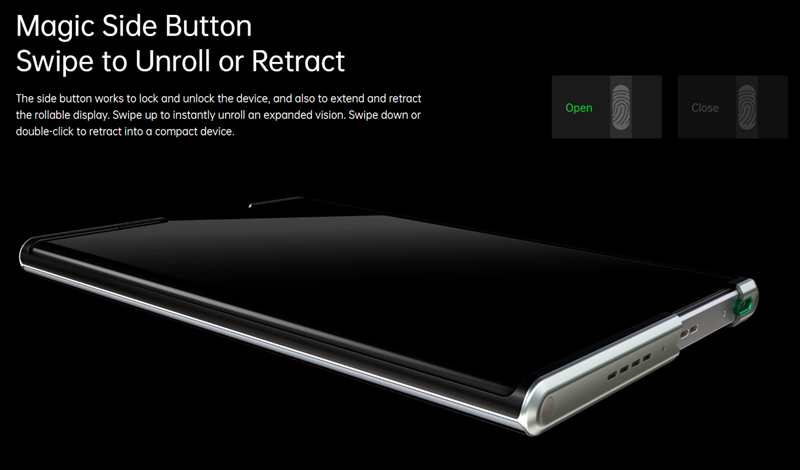 오포엑스(oppo x)는 감아올렸을 떼 6.7인치였던 화면이 쭉 잡아펴면 7.4인치로 확장하는 컨셉을 보여주고있다. 물론 우리가 상상하는 것처럼 완전하게 돌돌 말아넣는 구조는 아니다. 롤러블 보다는 쭉~펴는 스트레치 디스플레이가 맞지 않나 싶기도 하다. 사진에서는 전면카메라를 전략적으로 뺄 수 밖에 없었던거 같다. 측면에 있는 매직버튼으로 스마트폰 디스플레이를 자동으로 늘리고 줄일 수 있다.