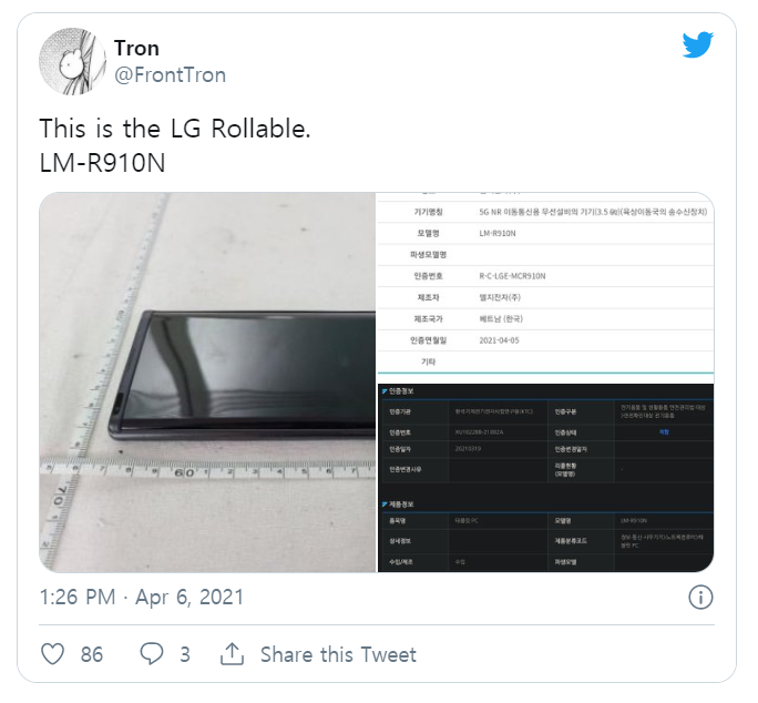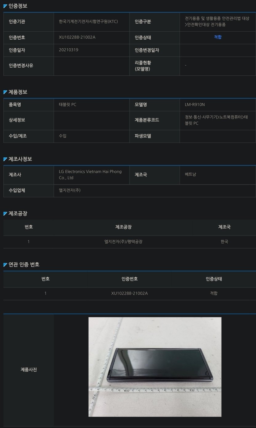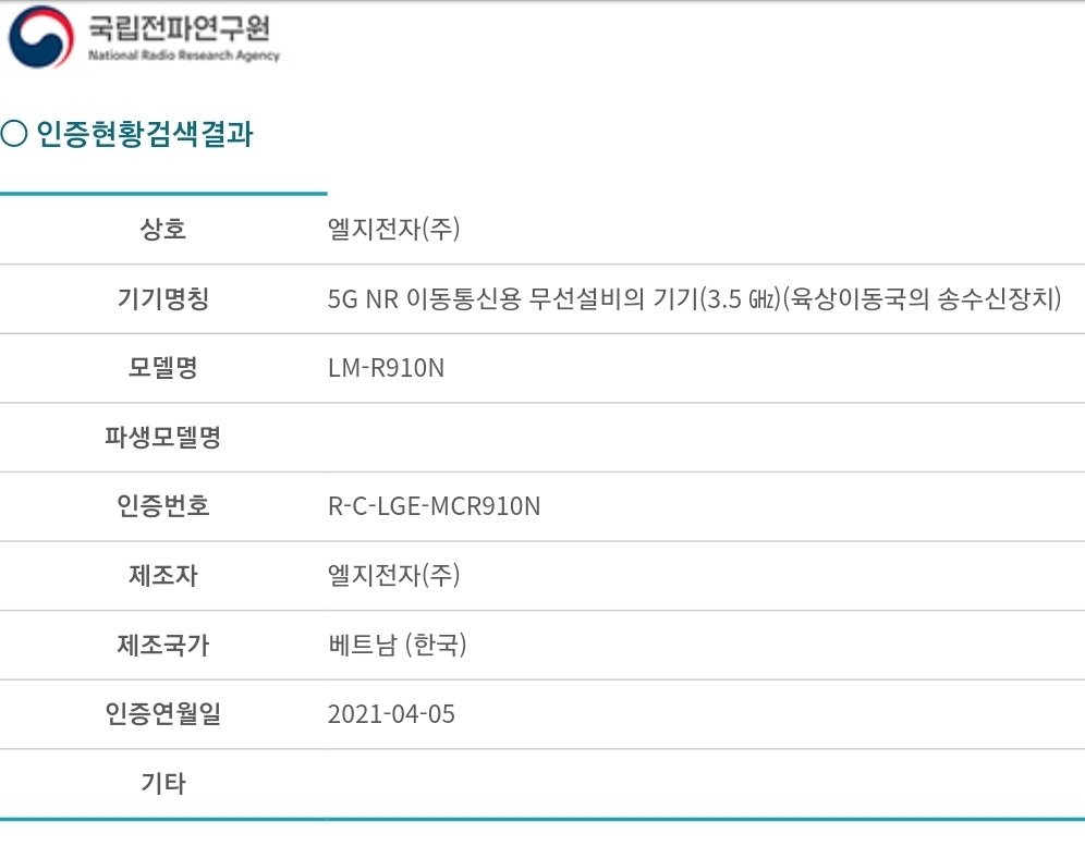 국립전파연구원에 전파인증까지 받았었네요. 하필 인증연월이 2021년 4월 5일입니다. LG는 4월 6일에 스마트폰 사업 철수를 확정하죠.